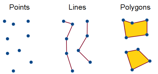 Vector data models represent spatial features using points and their associated X, Y coordinate pairs, similar to a hand-drawn map. There are three types of vector data these are Points, Lines, and Polygons.
