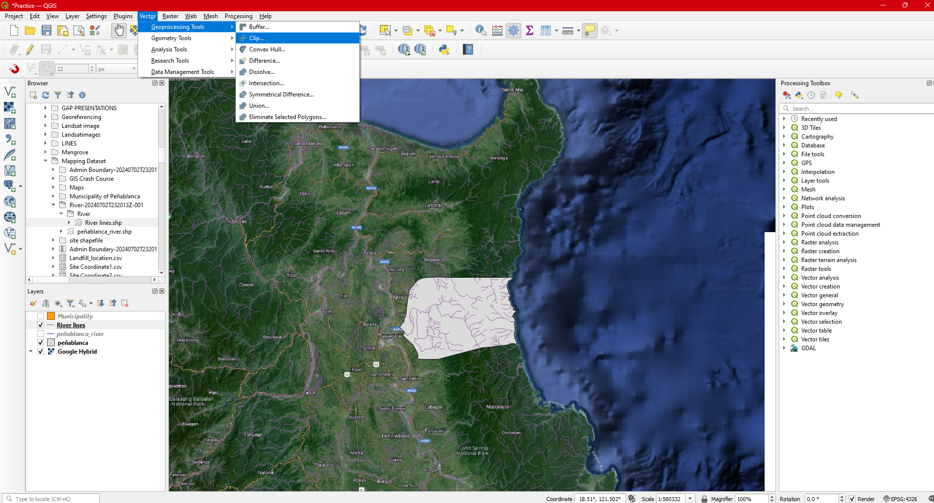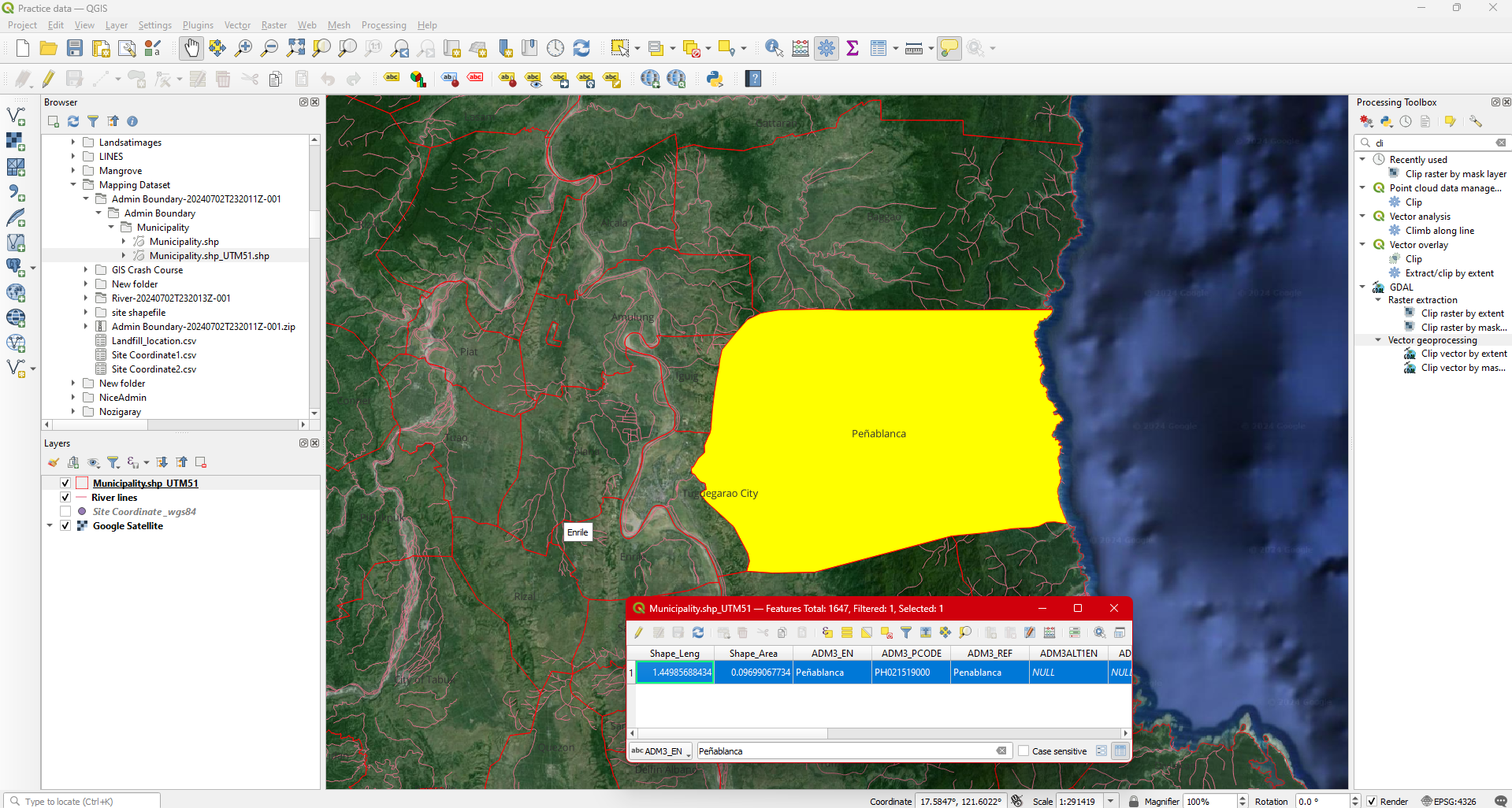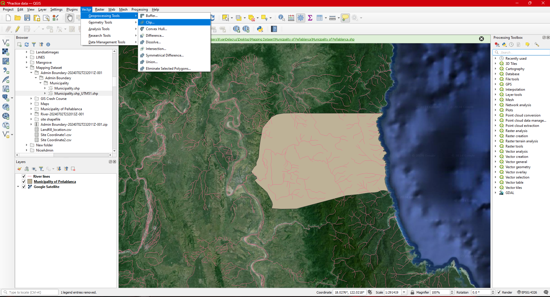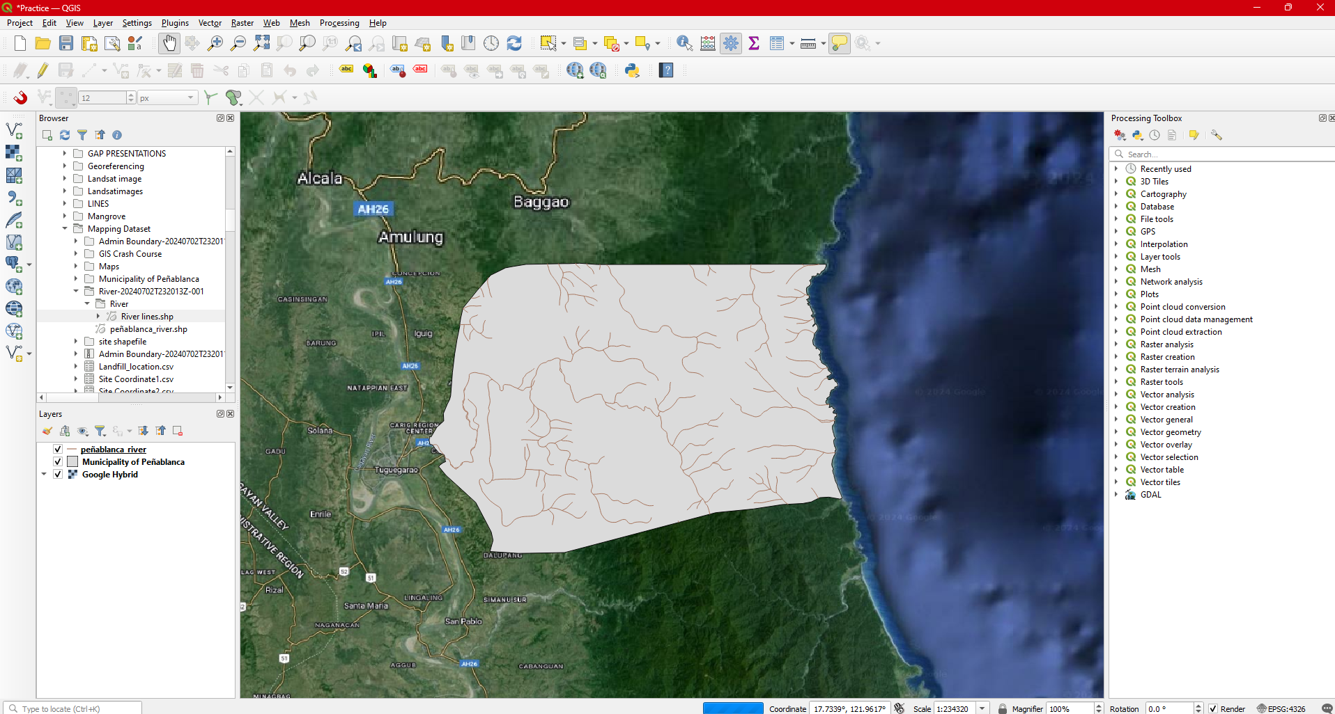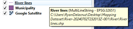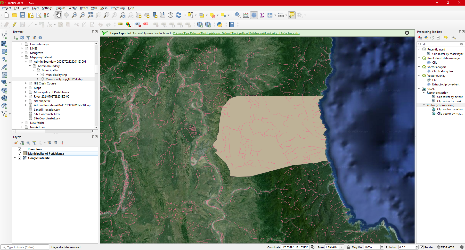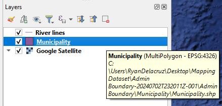 Step 16. Remove River lines from the Layers pannel . You now have the Municipal boundary of Peñablanca and rivers within the municipality.