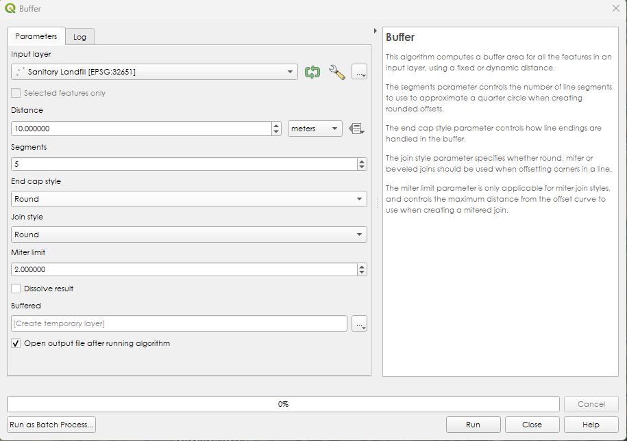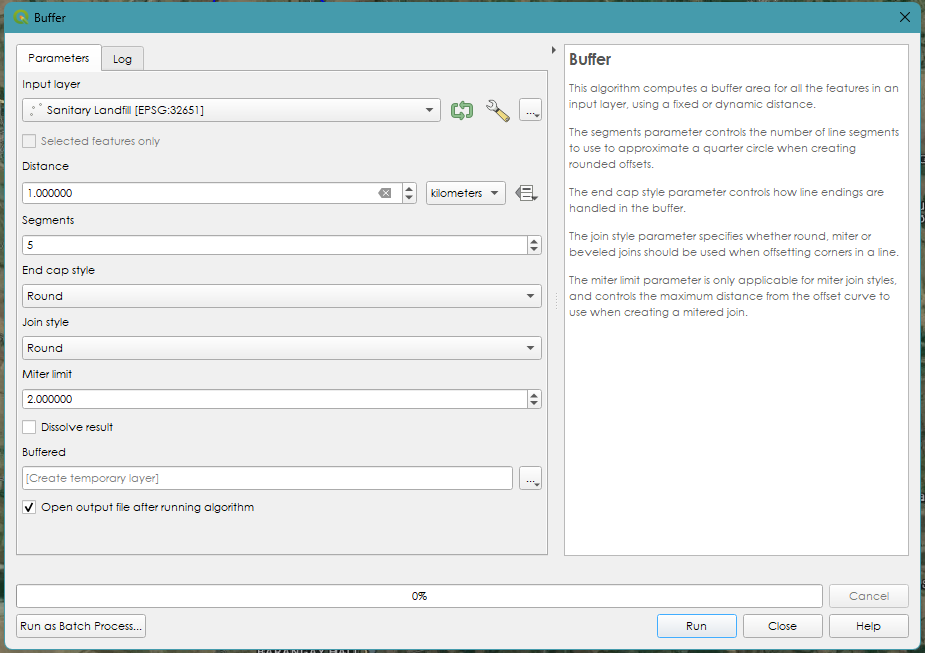 Step 3. On the dialog box, select “Sanitary Landfill” as the Input Layer. On the Distance change the meters into Kilometers and the distance value to 1. Leave other values the same and click Run.