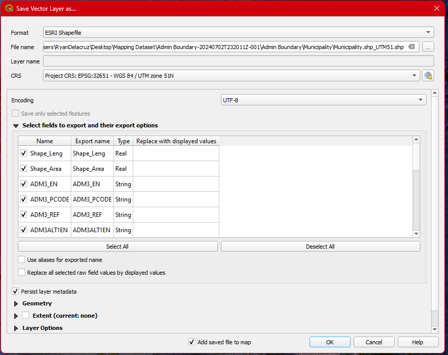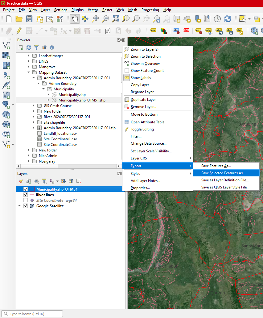 Step 4. Export the Municipality.shp and transform its CRS into EPSG: 32651- UTM51N. To do this Right Click the