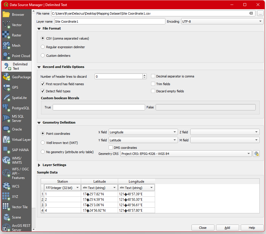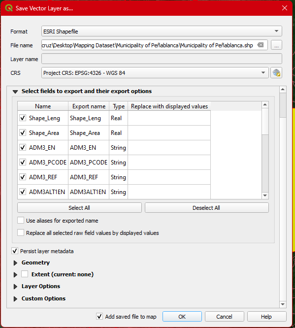 Step 12. In the dialogbox, set Fortmat as ESRI shapefile . Click the browse button and create a folder name Municipality of peñablanca and Save the shapefile as Municipality of Peñablanca.shp. Set the CRS to EPSG: 32651 Don’t forget to check the