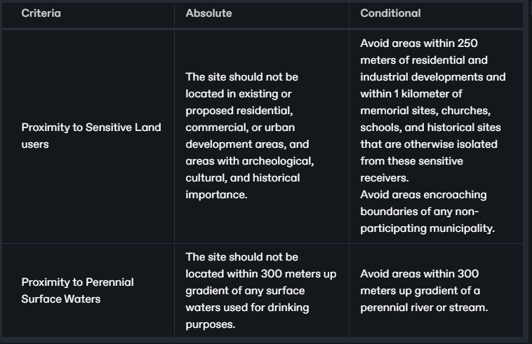Suppose we are tasked to evaluate an existing sanitary landfill and below is a table showing some of the criteria for evaluation based on DAO 1998-50. We only take two example criteria to show how the buffer tool is used for the evaluation of landfill site identification and screening criteria for municipal solid waste disposal facilities.