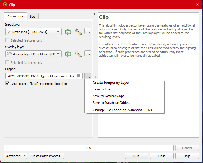 Step 15. In the Input layer select River lines while in the Overly layer select Municipality of Peñblanca. Click the