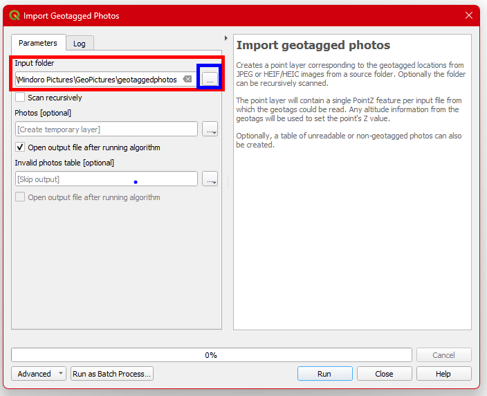 the browse button to look for the folder where you put all the geotaggedphotos you’re going to import. After finding the folder, click Run.