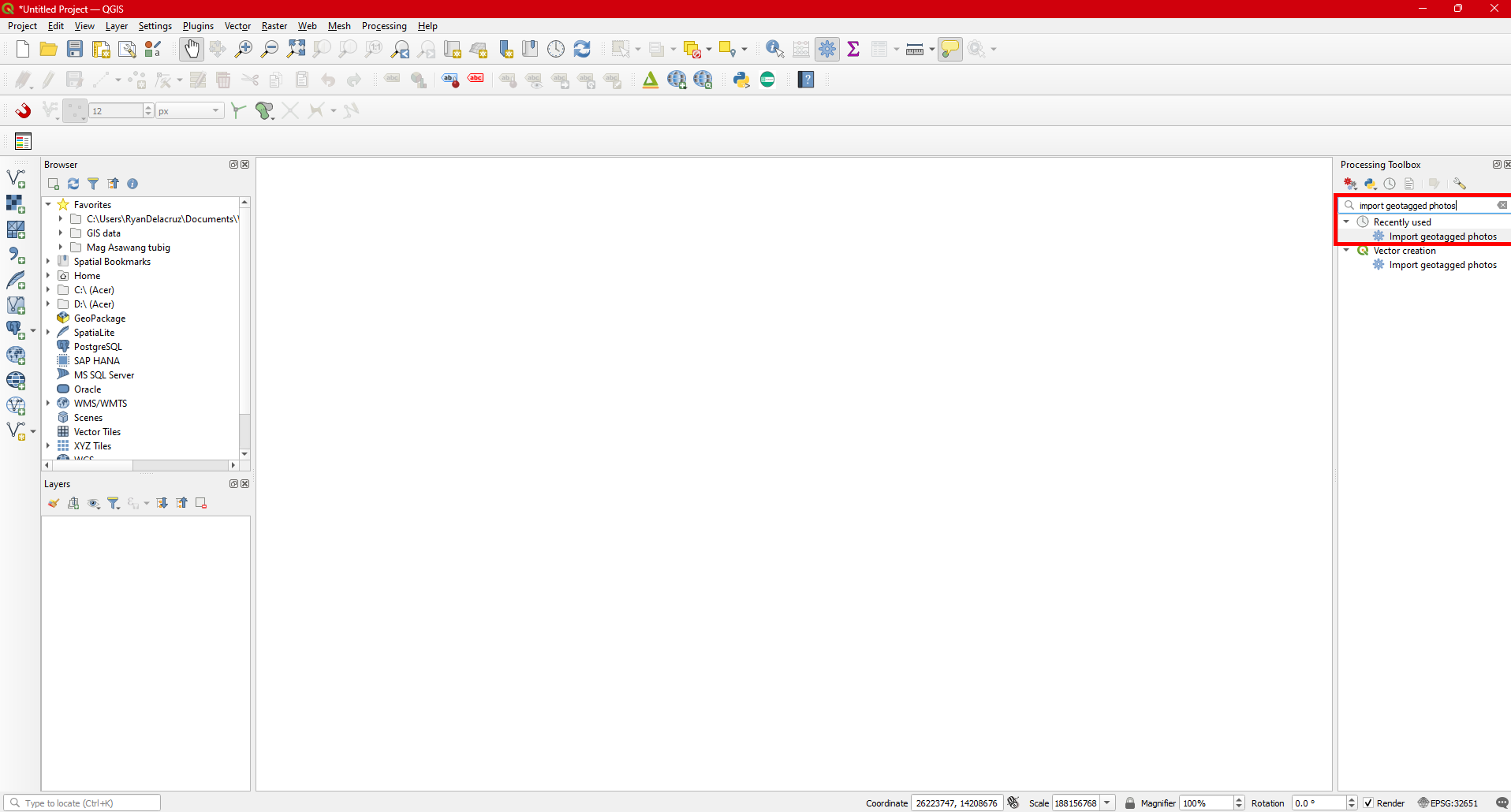 Step 3. To load the geotaggedphotos, under Processing Toolbox, type in Import Geotagphoto in the Searchbox. Select it and Double click on it to open the tool.
