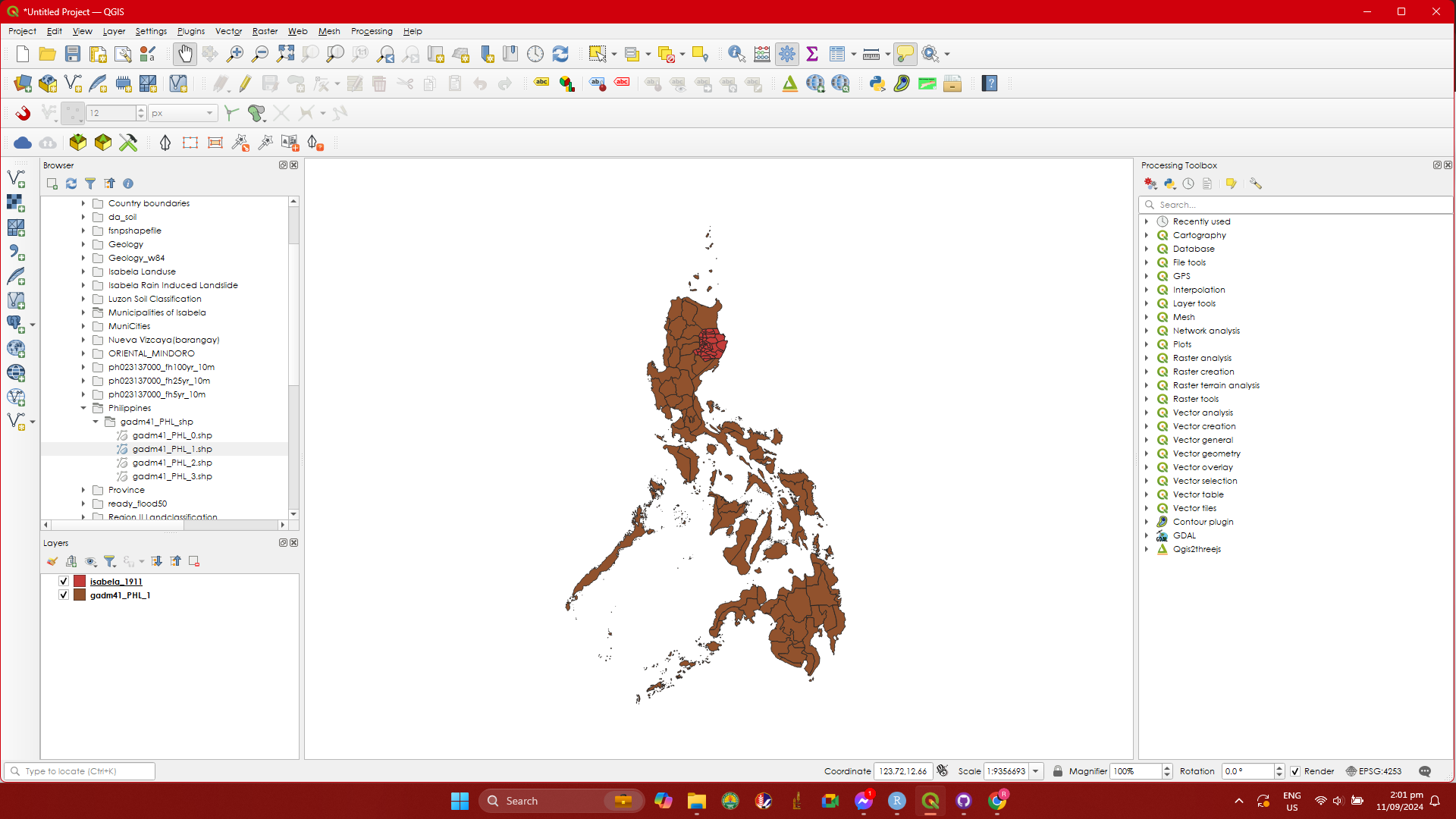 Step 2. Follow the steps on how to load shapefiles in this section Loading a shapefile. Load the Isabela_1911 and gadm41_PHL_1.shp into your QGIS. If a dialogbox will appear when loading gadm41_PHL_1.shp, just click OK.