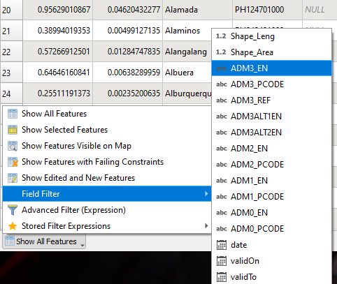 . Click this button to show some options. Click the Field Filter and hit ADM3_EN . This field contains the name of each municipality.
