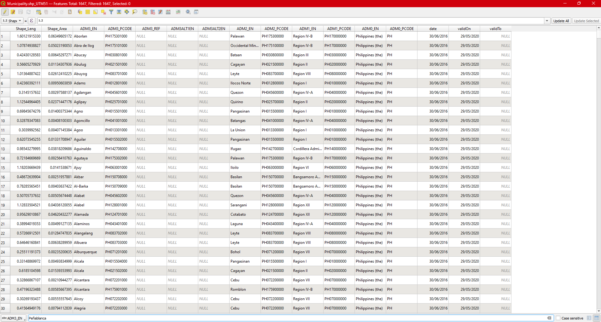 Step 10. The attribute table will only show the queried name of the municipality. Select the municipality by clicking the id number. You will observed that the selected municipality will be filled with yellow color. This is just an indicator this feature is selected.