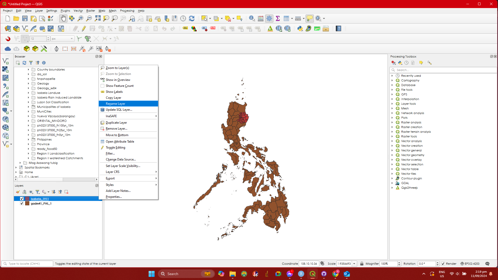 Step 1. First we will do styling on the Isabela_1911 layer. We will change the name of this layer into Municipality of Isabela. To do this, Right click on the Isabela_1911 layer and click Rename Layer then type Municipality of Isabela. Do the same with the gadm41_PHL_1 change it into Regional Boundary.